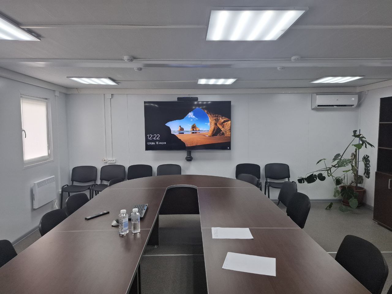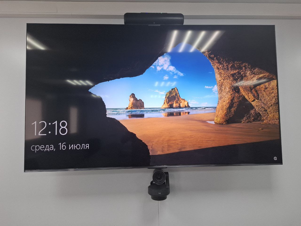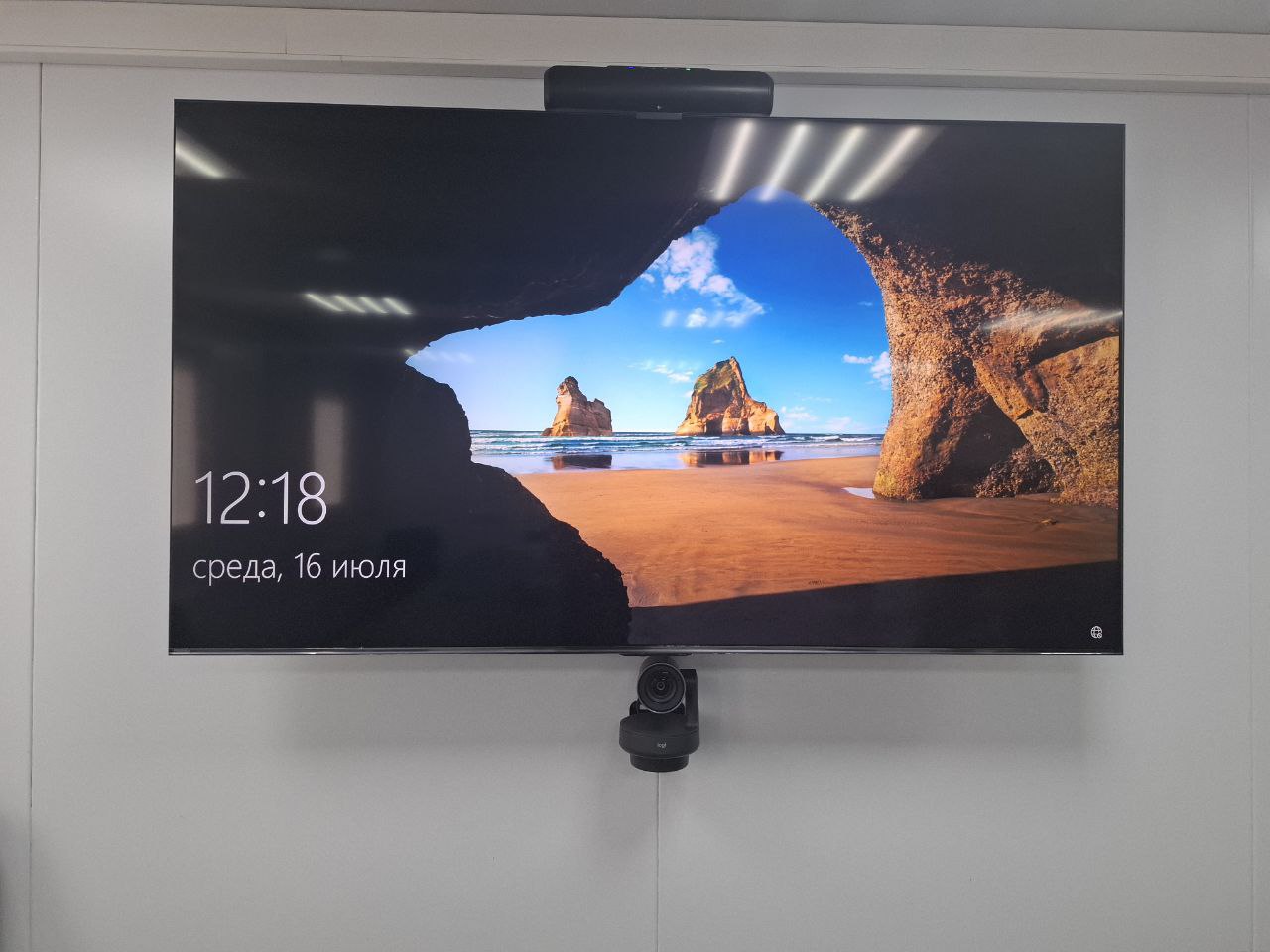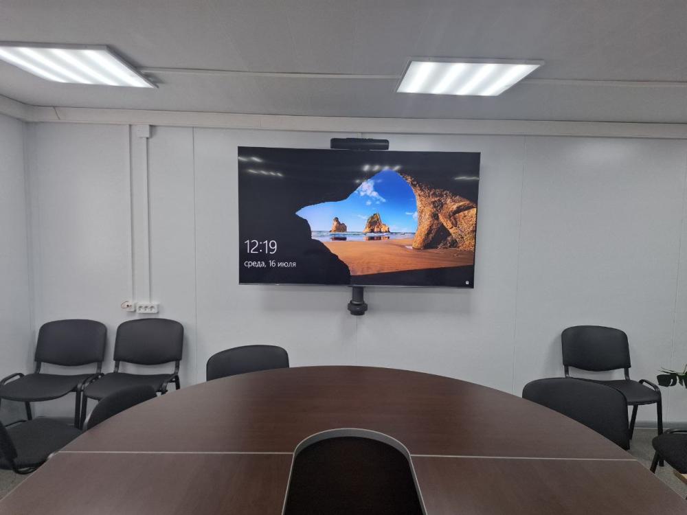 - Установлена профессиональная камера для видеоконференций. Устройство смонтировано в оптимальном месте для обеспечения качественного обзора и захвата всех участников совещания.
